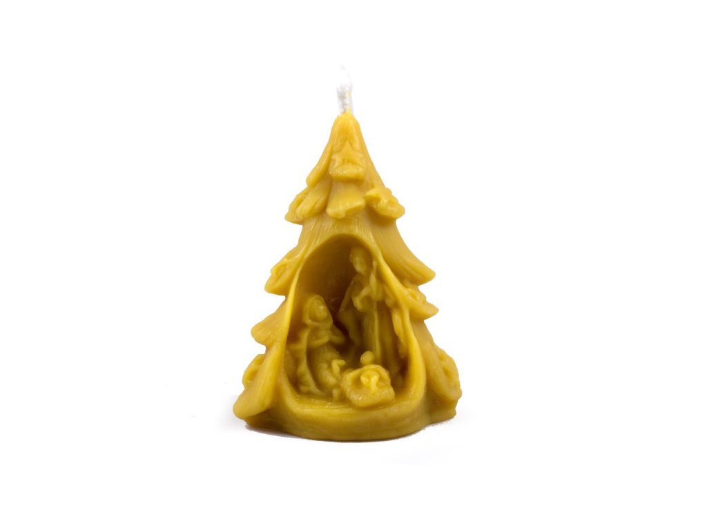 Vánoční svíce z včelího vosku ve tvaru stromu, v jehož dutině se ukrývá Svatá rodina.