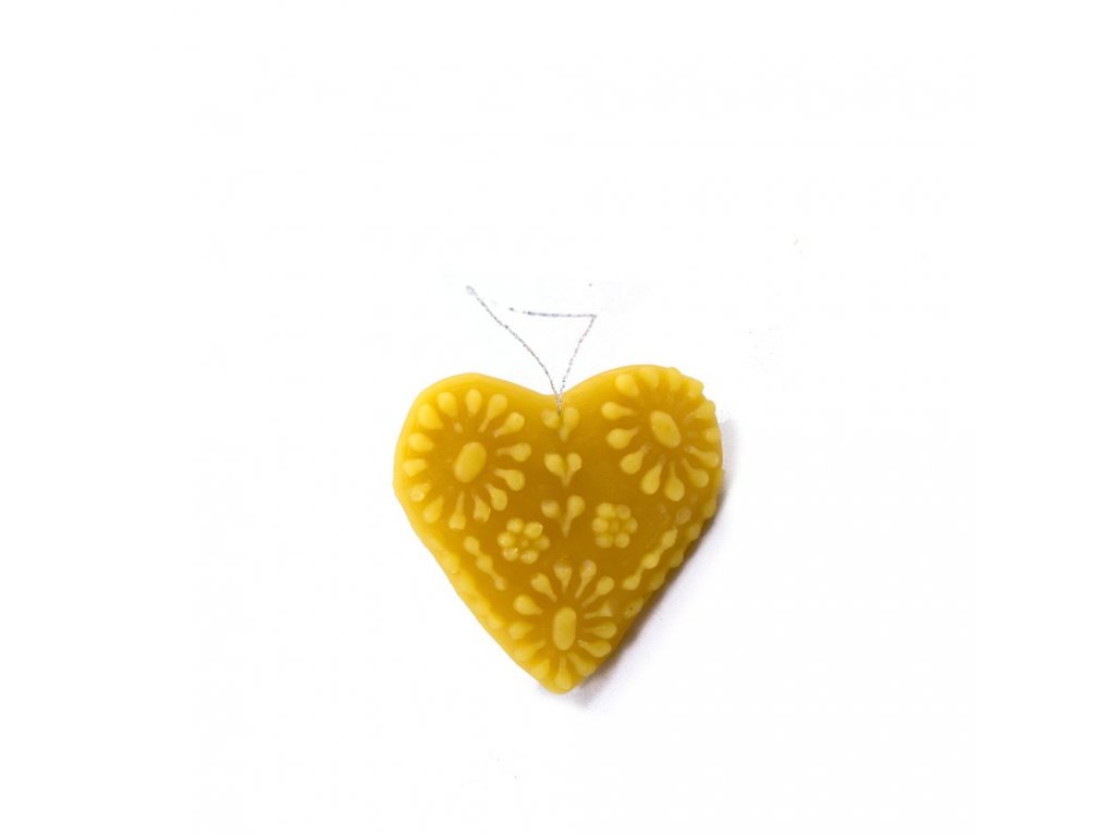 Závěsná dekorace ve tvaru květinového srdce je vyrobená z pravého včelího vosku.